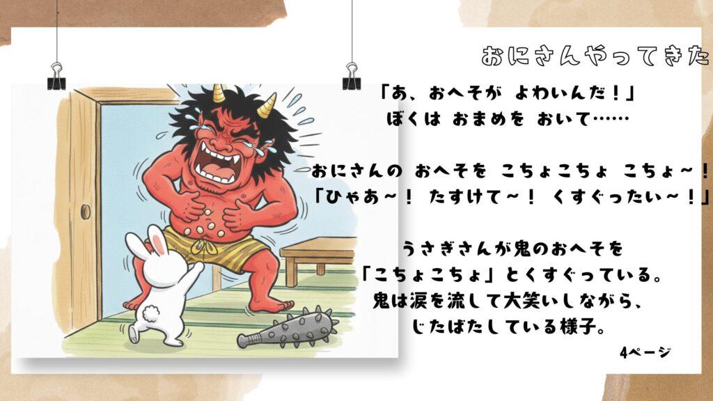 「おにさん、おへそが弱かったんだね!」と驚いたり、自分のへそを隠して笑ったり。