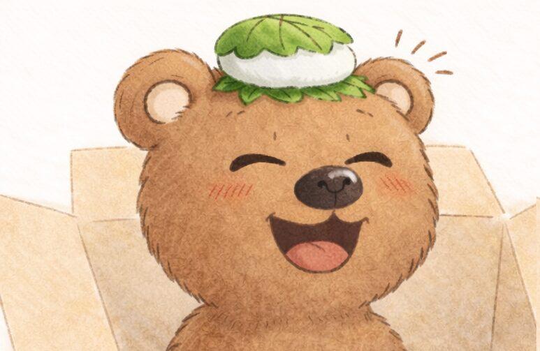 段ボール箱に入ってやってきた、言葉の種(ことのは)を育てる不思議なこぐま。頭に乗っているのは、彼の大切なエネルギー源であり、心のバロメーターでもある「魔法のかしわ餅」です。