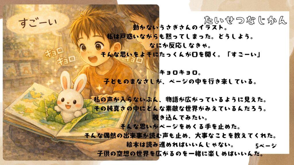 この記事では、ページをめくる手を止めた瞬間に見えた、子供の純粋な世界と「沈黙の価値」を物語形式でお伝えします。
