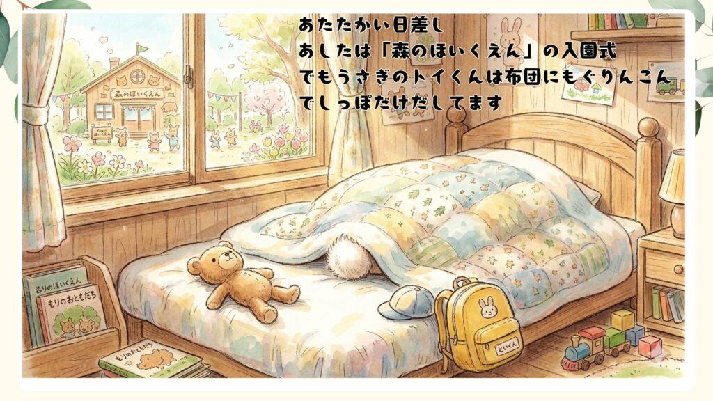 「おともだち、いっぱいできるかな?」 お布団に入っても、長くて大きなお耳がピンと立ってしまい、胸がドキドキして眠れないトイくん。
