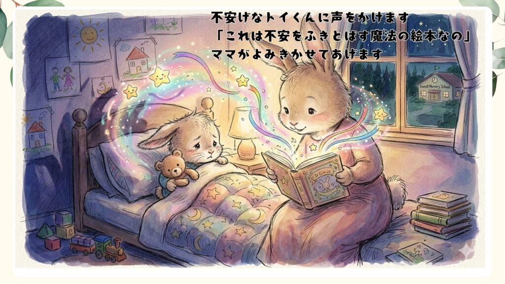 不安でいっぱいの小さな背中を優しく包み込んだのは、ママの読んでくれた「魔法の絵本」でした。